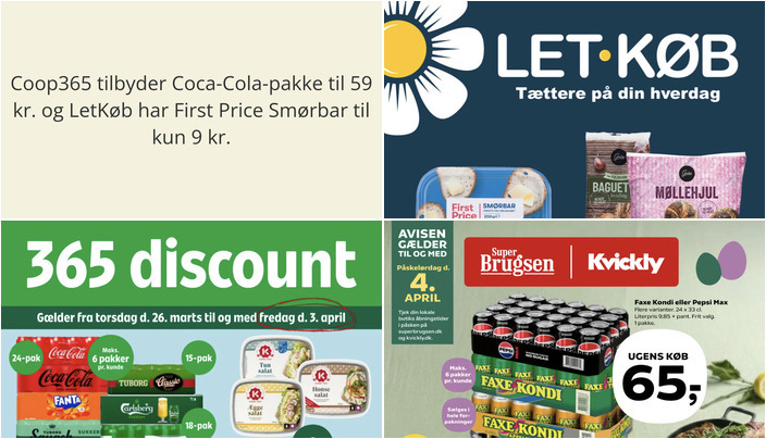 Hos Coop365 kan du få en pakke med 15-24 x 33 cl. Coca-Cola, Fanta, Tuborg Squash eller Carlsberg, Tuborg til en pris på kun 59 kr. Tilbuddet gælder fra torsdag den 26. marts til fredag den 3. april. Bemærk, der er en begrænsning på maksimalt 6 pakker pr. kunde.