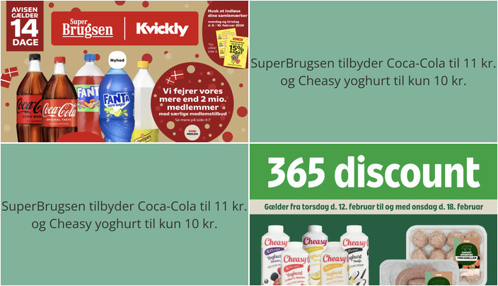 SuperBrugsen tilbyder Coca-Cola, Fanta eller Schweppes i flere varianter (125-150 cl) til kun 11 kr. pr. flaske. Dette tilbud er gældende fra fredag den 6. februar til torsdag den 19. februar 2026, men bemærk, at der er et begrænset parti.